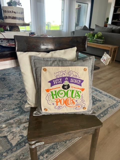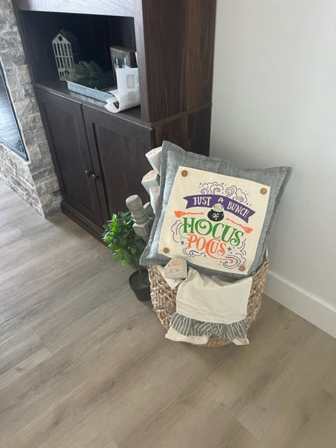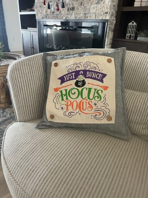 This is for the SQUARE pillow. HOCUS POCUS and all the witchy things! We loooove to have big Halloween parties here at the haunted farmhouse. Be on watch on our Instagram page @PillowPanels for DIY witches brew and making our witch costumes on a budget too!